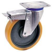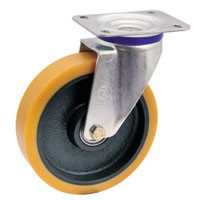Колеса с ошиновкой из вулколана, жесткость 93 шор А, центр из механического чугуна. Два шарикоподшипника и распорная втулка.